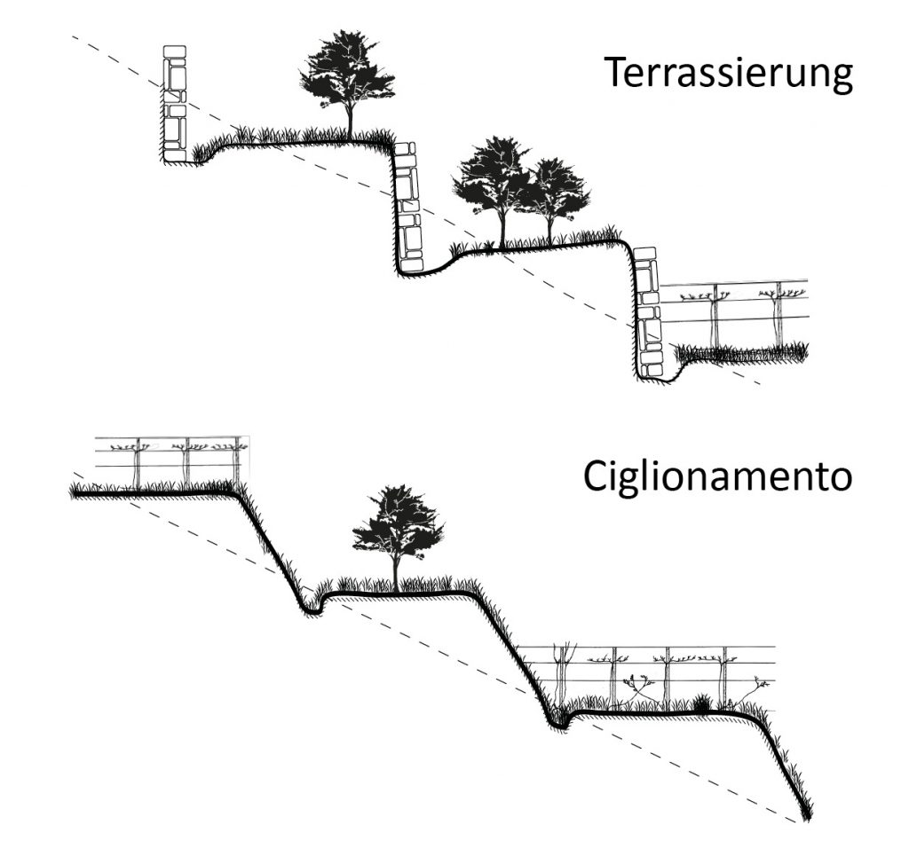 Risiko zu reduzieren. Es geht um die Terrassen (mit Stützmauern) und die sogenannte Ciglionamenti (Böschungen).