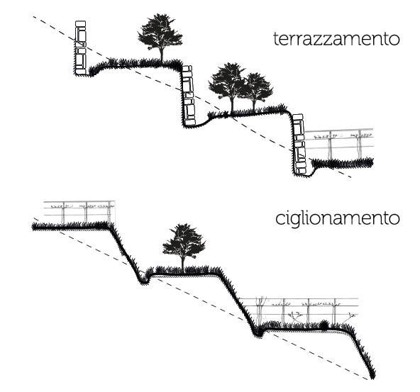 Until a few decades ago, the territory of the Vesuvius National Park still had a strongly agricultural connotation. In order to cope with the frequent landslides on the slopes, especially on Mount Somma, farmers have learned to shape the sides of the mountain with agricultural arrangements that allow, at the same time, to obtain cultivable areas and systems to reduce the hydrogeological risk. It’s about the terracing and the “ciglionamenti”. These are differentiated by the presence in the first of a retaining wall, and in the second of embankments.